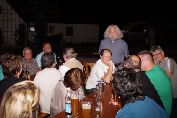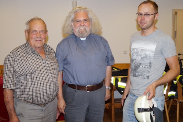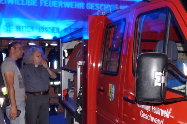 Der monatliche Dämmeschoppen der FFW Geschwand am 23. Juli 2015 stand ganz im Zeichen des Besuches von Pfarrer Peter König. Der Straubinger Stadtpfarrer pflegt eine jahrzehtelange Freundschaft mit einer Geschwander Familie und besucht auch immer wieder mal Geschwand. Bei seinem letzten Besuch am 23. Juli 2015 zeleprierte Pfarrer König einen Gottesdienst in der Geschwander Filialkiche "Mariä Himmelfahrt". Zuvor weihte er noch drei neue Fahrzeuge. Beim anschließenden Dämmerschoppen am Feuerwehrhaus suchten und fanden die Geschwander und Lindner Bürger bei herrlichem Sommerwetter das Gespräch mit Pfarrer König, der vor kurzem sein 30-jähriges Priesterjubiläum feierte.