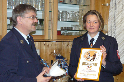 | Die Feuerwehrkameradin und Kameraden Sabine Seyschab und Michael Zitzmann leisteten 25 Jahre aktiven Dienst, Hans Brendel (Adam) und Günther Steinhäußer leisteten 40 Jahre aktiven Dienst in der Freiwilligen Feuerwehr Geschwand. Eine zusätzliche Ehrung für aktive Feuerwehrkameraden wird im Rahmen des Florianstages in Obertrubach für alle vier Gemeindewehren vom Landkreis Forchheim durchgeführt. |