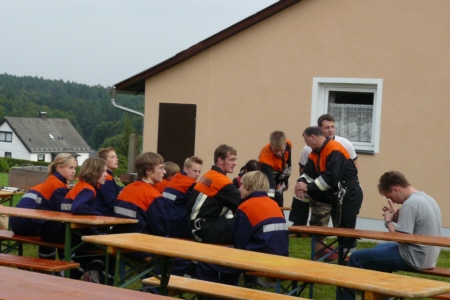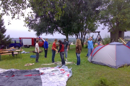 Am Freitag wurde das Zeltlager aufgebaut, eine Feuerstelle ausgehoben, eine Löschübung beim Anwesen Georg Hofmann abgehalten. Anschließend wurde am Feuerwehrhaus gegrillt. Danach begaben sich die Jugendlichen zum Zeltplatz.