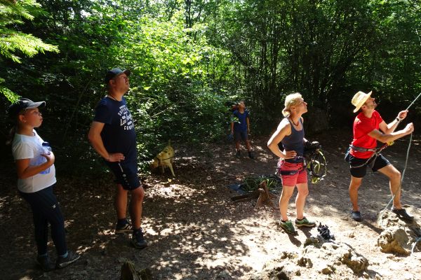 | Herwig Sedlmayer (grüne Hose) und Katrin Sedlmayer (blaues Top) führten in einer Schnupperstunde den Geschwander Kids an das Klettern heran |