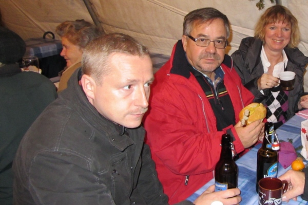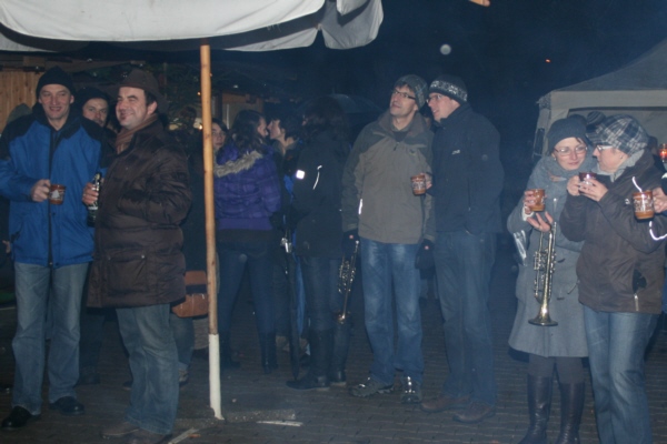 | Zum zweiten Mal bauten die Mitglieder des FSV Geschwand die Buden und Zelte für die traditionelle "Geschwander Weihnacht" am 03. Dezember 2011 auf dem Bürgerplatz auf. Aufgrund der schwindenden Besucherzahlen an den Sonntagen der vergangenen Jahre entschied sich die Vorstandschaft des FSV Geschwand in diesem Jahr die "Geschwander Weihnacht" nur noch am Samstag auszurichten. Bei windigem und regnerischem Wetter und Temperaturen um 5°C wurden auf dem gut besuchten Weihnachtsmarkt mit Glühwein, selbstgebackenen Lebkuchen und Waffeln, sowie fränkischen Bratwürsten ein paar besinnliche vorweihnachtliche Stunden gefeiert. Ein vorweihnachtliches Konzert mit dem Gesangverein "Gemütlichkeit"