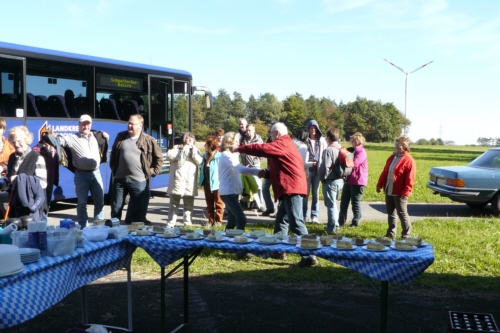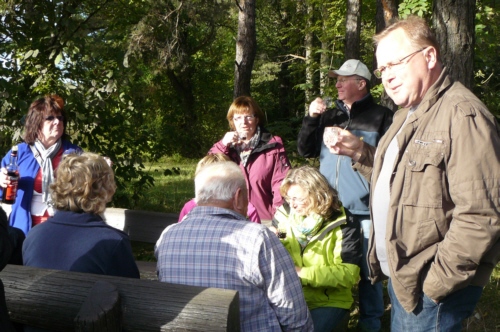| Auf Einladung von Georg Wiesheier aus Hirschaid, dessen Wurzeln in Geschwand liegen, und dessen Frau Hildegard führte die traditionelle Herbstwanderung des FSV Geschwand die 36 Wanderfreunde am 03. Oktober 2013 auf die "Friesener Warte". Bei kühlem aber sonnigem und trockenem Herbstwetter konnten die FSV-ler wunderbare Aussichten auf Bamberg und der Umgebung genießen. Gleich bei der Ankunft mit dem Bus wurden die Wanderfreunde mit einem Buffet aus Kaffee und Kuchen und einer kleinen Brotzeit empfangen und auch während der Wanderung gab es "Verpflegungsstationen". Die Friesener Warte ist ein 561m hoher Berg der