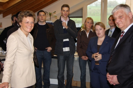 | Eine aufmerksame Zuhörerin fanden Willi Müller, Firmenchef von Schmetterling in Geschwand im Oberland der Fränkischen Schweiz, und seine Mitarbeiter in der hiesigen CSU-Kandidatin für die Europawahl, Monika Hohlmeier. Elmar Singer führte Monika Hohlmeier durch die Firma. Ihr Anliegen war es, ein junges und erfolgreiches mittelständisches Unternehmen im Landkreis Forchheim auf einer Eurobustour kennen zu lernen, das die JU Oberfranken quer durch den Regierungsbezirk organisiert hatte. In Begleitung des JU Kreisvorsitzenden Michael Hofmann und Maria Sponsel vom JU Kreisvorstand sowie zahlreicher Vertreter der örtlichen wie der CSU aus ganz Oberfranken lernten die Besucher eine Firma auf höchstem technischen Niveau kennen.Der kurzen Firmenpräsentation folgten eine zwanglose Aussprache sowie eine kleine Firmenführung. Müller ging nochmals auf seine Anfänge zurück, wo er zunächst als gelernter Landwirt 1967 noch große andere Pläne in seiner damaligen Branche verfolgte, zweifelte die Machbarkeit bei näherem Hinsehen aber an, besann sich neu und besitzt heute ein hoch innovatives Unternehmen der Reisebranche mit über 400 wertvollen Arbeitsplätzen in einer strukturschwachen aber landschaftlich reizvollen Gegend, darunter Topspezialisten aus ganz Deutschland. „Vielseitig wie die Welt“ ist seit 1980 der Slogan und in der Tat ist man auch in diversen Sparten die Nummer eins europaweit. Schmetterling arbeitet mit 3500 Reisebüros weltweit zusammen und verfügt über internationale Partnerschaften von Südafrika bis Kanada und von Indien bis Australien. Größter Wert wird auf die Ausbildung im eigenen Haus mit einer Quote von 10 bis 15 Prozent in den verschiedensten Bereichen gelegt. Außerdem belegt Schmetterling ständig vier Studienplätze in Ravensburg. Abwerbungen dieser guten Kräfte durch den Wettbewerb seien dabei immer ein Thema. Dabei, so Müller, sei Wohlfühlen mehr als nur ein Gehalt. Dazu gehört auch, das die Mitarbeiter in der Region heimisch werden. Er betonte einmal mehr den Charakter seines heimatverbundenen Familienunternehmens, das auch von seiner Frau Cäcilie, den Töchtern Anja und Daniela sowie den Schwiegersöhnen mit Herzblut geführt wird.Genauer hat Monika Hohlmeier sicher auch hingehört, als Schwiegersohn Elmar Singer die oft sinnlosen Vorgaben der EU anprangerte. Wo Gesetzte auch zu kurzatmig erlassen würden. Omnibusse vor 2004 beispielsweise hatten Euronorm 3 und dürfen nach den neuen Vorgaben nicht mehr in große Innenstädte wie München fahren. Soll man solche Fahrzeuge, die vielleicht noch 50 Prozent und mehr Wert besitzen, dann wegwerfen, wer kann sich das leisten?Singer geißelte auch die Abgasnormen, wo höherer Verbrauch die Vorgaben zu Makulatur werden lassen. Monika Hohlmeier meinte, die Deutschen hätten bei der Auslegung von EU-Rahmenbedingungen leider einen besonderen Eifer. Mitarbeiterin Denise Jurrat mahnte das EU-Reiserecht an, das in den einzelnen Ländern doch sehr unterschiedlich gehandhabt werde Willi Müller, der gleichzeitig Bürgermeister der Gemeinde Obertrubach ist, würdigte in diesem Zusammenhang auch die örtlichen Rahmenbedingungen, geschaffen durch eine seit 1950 mit Augenmaß und Solidität betriebenen Gemeindepolitik von CSU-Bürgermeistern. Weitab von den infrastrukturstärkeren Gemeinden in Stadtnähe habe man hier dennoch alle zeitgemäßen kommunalen Einrichtungen. Und das bei einer Verschuldung weit unter dem Landesdurchschnitt. |