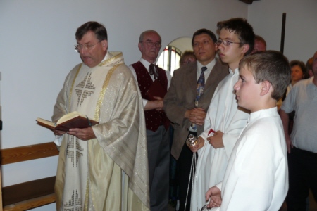 | Am 15. August 2007 (Mariä Himmelfahrt) wurde die von Willi Müller gestiftete Orgel im Rahmen eines von H. H. Pfarrer Werner Wolf zelebrierten Festgottesdienstes geweiht. Organist Richard Mager spielte zu diesem Anlass Trompet Voluntary von John Stanley, das Ave Maria von Franz Schubert und Hornpipi/Wassermusik von Händel. Umrahmt wurde der Gottesdienst von der Singgruppe des FSV Geschwand. Anschließend trafen sich die Geschwander und Lindner Bürger im Zelt unterhalb der Kirche bei Bier und Gegrilltem zum gemütlichen Beisammensein. Der Erlös der Orgelweihe und des Festes kam der Geschwander Kirche zu Gute. |
